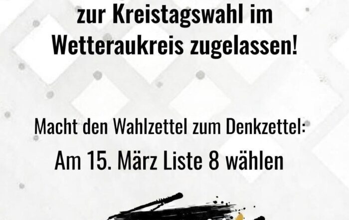 Der heutige Info-Stand in der Wetterauer Kreisstadt Friedberg verlief sehr positiv. Viele Bürgerinnen und Bürger kamen vorbei, informierten sich und führten angeregte Gespräche mit uns. Am 15.03. zur Kreistagswahl mit allen 81 Stimmen – Die [...]